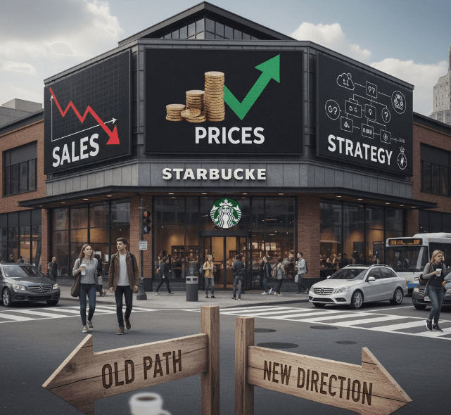 Kết quả kinh doanh của Starbucks đang suy yếu. Công ty thông báo sẽ đóng hàng trăm cửa hàng và cắt giảm 900 vị trí việc làm văn phòng. Tốc độ tăng trưởng doanh số cùng cửa hàng (same-store sales) chậm lại, trong khi khảo sát của UBS cho thấy hơn 70% người tiêu dùng Mỹ dự định ghé Starbucks ít hơn, lý do chủ yếu là giá quá cao.