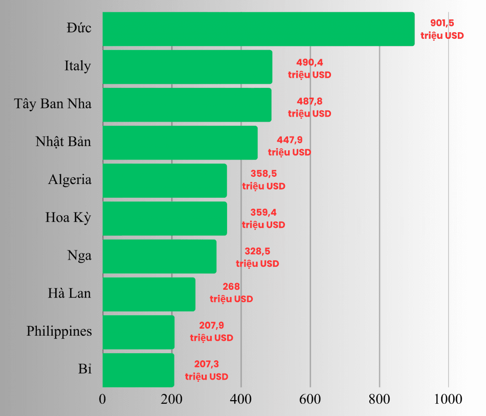 top 10 thị trường nhập khẩu cà phê lớn nhất của Việt Nam (đơn vị: triệu USD)